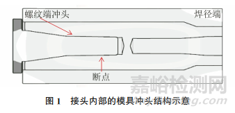 H13鋼是一種新型的中合金鉻系熱作模具鋼,該鋼既具有較高的強(qiáng)度,又能在較高的強(qiáng)度下保持較高的韌性,淬透性較好,可以滿足熱作模具的使用要求。在高溫作用下,H13鋼具有抗軟化能力,但是當(dāng)溫度高于540℃時(shí),其硬度會(huì)出現(xiàn)迅速下降的現(xiàn)象,所以在熱模鍛造過(guò)程中,通常規(guī)定了合理的鍛造成型和脫模時(shí)間,可避免 H13鋼模具在高溫?cái)嗉?nèi)部溫度較高,造成模具的整體力學(xué)性能下降。由于設(shè)備操作不當(dāng),某公司H13鋼模具沖頭在高溫鍛件內(nèi)的停留時(shí)間過(guò)長(zhǎng),靠近沖頭的端部發(fā)生了早期斷裂。該模具沖頭加工的鉆桿接頭規(guī)格為NC40,主要用于接頭螺紋端內(nèi)孔成型。將鉆桿接頭粗鍛成毛坯后的溫度約為1050℃,再將接頭放入模鍛設(shè)備內(nèi)進(jìn)行接頭的中部孔成型。接頭內(nèi)部的模具沖頭結(jié)構(gòu)如圖1所示,左側(cè)為母接頭的螺紋端,右側(cè)為接頭焊徑端,兩端同時(shí)有一個(gè)沖頭對(duì)接頭進(jìn)行內(nèi)孔成型,斷裂的沖頭為螺紋端沖頭。研究人員采用一系列理化檢驗(yàn)和熱模擬分析方法研究了該沖頭發(fā)生早期斷裂的原因,并提出了改進(jìn)建議,以防止該類問(wèn)題再次發(fā)生。