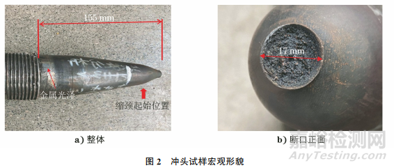 模具沖頭材料為4Cr5MoSiV1鋼,沖頭試樣宏觀形貌如圖2所示,該沖頭尺寸如圖3所示。沖頭斷裂位置靠近小徑端,距離法蘭根部約155mm。斷裂沖頭與實(shí)際尺寸相比,在距離法蘭約102mm位置發(fā)生了縮頸,該位置的直徑為54mm,從該處開(kāi)始直徑急劇降低,直至發(fā)生縮頸斷裂,斷口正面宏觀形貌如圖1b)所示,斷面直徑為17mm,原始直徑為52mm,縮頸率為88%。據(jù)此,可以初步判斷沖頭發(fā)生了塑性斷裂。