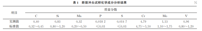 在沖頭上截取試樣,用直讀光譜儀對(duì)試樣進(jìn)行化學(xué)成分分析,結(jié)果如表1所示。由表1可知:該沖頭材料符合GB/T 1299—2000《合金工具鋼》對(duì)H13鋼的規(guī)定。