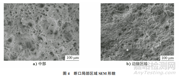 清洗斷口試樣,先用洗潔精洗掉表面的油污,然后在超聲波中用丙酮清洗試樣,將試樣清洗完畢后吹干,再將其置于SEM下觀察,結(jié)果如圖4所示。由圖4可知:整個(gè)斷口主要以韌窩形貌為主,靠近斷口邊緣的韌窩嚴(yán)重傾斜變形,說(shuō)明沖頭斷裂時(shí)發(fā)生了嚴(yán)重的變形現(xiàn)象。