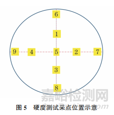 在靠近導(dǎo)向未變形區(qū)域截取15mm厚的片狀試樣,將試樣編號(hào)為 Y1;在距離導(dǎo)向未變形區(qū)域約102mm的輕微變形區(qū)域截取15mm 厚的片狀試樣,將試樣編號(hào)為Y2。Y1和Y2的取樣位置在圖3中標(biāo)出。對(duì)這兩個(gè)試樣分別進(jìn)行洛氏硬度測(cè)試,其中測(cè)點(diǎn)5為心部,測(cè)點(diǎn)1~4為半徑中部,測(cè)點(diǎn)6~9為靠近外壁,采點(diǎn)位置如圖5所示,測(cè)試結(jié)果如表2所示。由表2可知:試樣Y1的平均硬度為48.9HRC,試樣Y2的平均硬度為23.8HRC;試樣Y1的硬度符合技術(shù)協(xié)議規(guī)定,試樣Y2的硬度不符合技術(shù)協(xié)議規(guī)定。