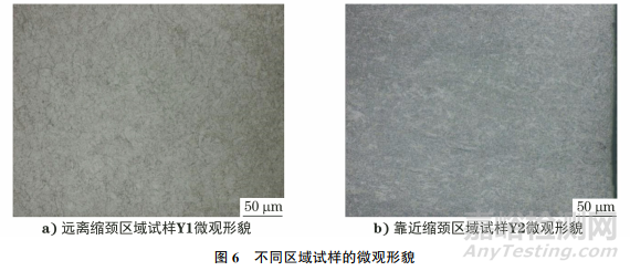 在試樣Y1上截取部分區(qū)域作為金相試樣,觀察面為橫截面,用體積分?jǐn)?shù)為4%的硝酸乙醇溶液腐蝕試樣,再將試樣置于光學(xué)顯微鏡下觀察,結(jié)果如圖6a)所示。由圖6a)可知:心部及靠近外壁的組織為回火馬氏體,尤其是靠近外壁的組織還保留部分馬氏體位向,晶界較為明顯,說(shuō)明碳化物析出偏聚在晶界上,組織呈低溫回火形貌,所以其硬度較高,平均硬度為48.9HRC。