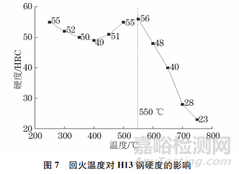 模具沖頭的熱處理工藝為整體調(diào)質(zhì)熱處理,熱處理環(huán)境及條件都是一樣的,獲得的組織及硬度也是相當(dāng)?shù)模强拷鼘?dǎo)向部位的組織為回火馬氏體,碳化物聚集在晶界上,馬氏體位向明顯,呈低溫回火的組織形貌,硬度為48.9HRC??拷鼣嗫诓课坏慕M織為回火索氏體,碳化物彌散分布在整個(gè)組織上,為高溫回火組織,硬度為23.8HRC?;鼗饻囟葘?duì)H13鋼產(chǎn)品硬度的影響較大,取該沖頭的剩余試樣進(jìn)行熱處理試驗(yàn),加熱到試驗(yàn)溫度,保溫30min,再分別取樣,對(duì)試樣進(jìn)行洛氏硬度測(cè)試,回火溫度對(duì)H13鋼硬度的影響如圖7所示。當(dāng)加熱溫度超過(guò)550℃后,其硬度急劇下降,當(dāng)溫度升高至750℃時(shí),其硬度只有23HRC。