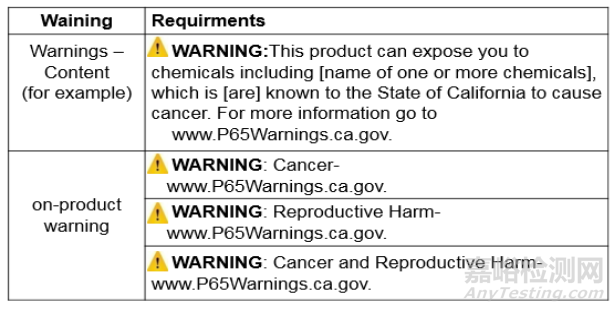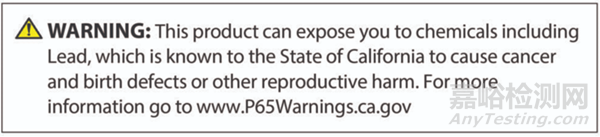 2016年8月30日,美國加州行政法辦公室批準(zhǔn)了針對(duì)加州65法案條款6“清晰合理的警告信息”的修訂案,新規(guī)于2018年8月30日生效,目前OEHHA計(jì)劃修訂關(guān)于警告標(biāo)識(shí)的相關(guān)要求。新規(guī)核心要求:“WARNING”必須顯示在左側(cè);警告語內(nèi)容中至少體現(xiàn)一種有害物質(zhì)名稱;新增On-product警告語,引導(dǎo)消費(fèi)者前往加州65官方網(wǎng)站。警示要求必須“清晰并合理”,可以采用多種形式:
