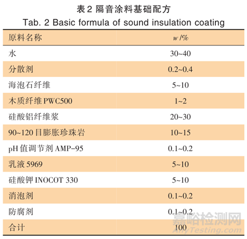 隔音有兩種方式:其一為阻擋聲音的傳播,通常來(lái)講密度越大的構(gòu)件,對(duì)聲波的吸收更少,更容易反射聲能。這類(lèi)應(yīng)用于樓板材質(zhì)通常為瓷磚、大理石地板等。并且是厚度越大,阻隔效果越好;其二為吸收入射聲能,聲波傳入材料內(nèi)部,在材料內(nèi)部振動(dòng)摩擦,轉(zhuǎn)化為熱能。這種材料一般為纖維狀或中空結(jié)構(gòu),本隔音涂料挑選0.5~1 mm海泡石纖維、1~3 mm硅酸鋁纖維、90~120 目膨脹珍珠巖、90~120 目聚苯顆粒作為隔音材料按表2配方制備涂料,進(jìn)行隔音效果對(duì)比測(cè)試。