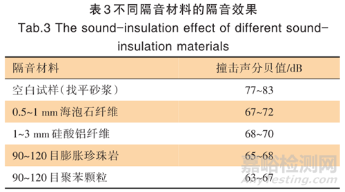 從表 3 可以看出,采用了隔音材料后,撞擊聲分貝值都會(huì)有不同程度的降低。這與各種材料的結(jié)構(gòu)有關(guān):海泡石纖維狀呈毛發(fā)狀、針狀,具有獨(dú)特的理化性能,它的比表面積高(可達(dá) 800~900 m/g),孔隙率大,擁有很強(qiáng)的吸附與催化能力。硅酸鋁纖維是一種新型、輕質(zhì)、節(jié)能的耐火材料,以焦寶石為主要原料,經(jīng) 2100 ℃的高溫熔化后,用高速離心法工藝加工而制成的棉絲狀無(wú)機(jī)纖維。采用 SEM 對(duì)硅酸鋁纖維的微觀(guān)形貌進(jìn)行觀(guān)察,發(fā)現(xiàn)硅酸鋁纖維呈圓柱形,表面非常光滑,吸音性好,對(duì) 500 Hz 以上中、高波可吸收80%以上,這種1~3 mm的長(zhǎng)纖維,還起到提升涂層抗裂性的作用 。