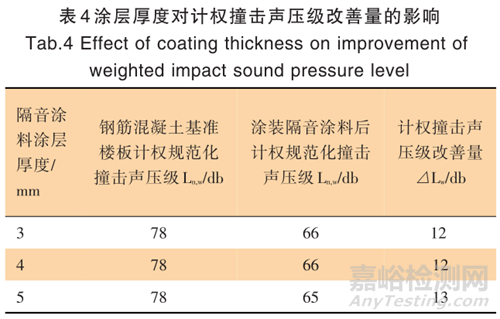 參照?qǐng)F(tuán)體標(biāo)準(zhǔn)T/GDJSKB 007—2022《建筑樓板用隔聲涂料》3.4撞擊聲改善量規(guī)范的測(cè)試方法:140 mm鋼筋混凝土樓板覆蓋 3 mm/5 mm 隔聲涂料、40 mm 普通水泥砂漿(水泥砂比為 1∶3)、10 mm 瓷磚之后三分之一倍頻程的規(guī)范化撞擊聲壓級(jí)的降低量。以表 2隔音涂料基礎(chǔ)配方制備樣料進(jìn)行測(cè)試,在計(jì)權(quán)規(guī)范化撞擊聲壓級(jí) L n , w =78 dB 的鋼筋混凝土樓板上分別制備 3mm、4 mm、5 mm 的涂膜后,進(jìn)行撞擊聲隔聲壓級(jí) L n , w 測(cè)試,計(jì)算出計(jì)權(quán)撞擊聲壓級(jí)改善量 △L w ,結(jié)果見(jiàn)表4。