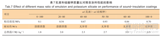 保持隔音涂料體系中其他的組分不變,改變聚合物乳液(BATF-5969)與硅酸鉀(INOCOT 330)質(zhì)量比,測(cè)試其涂層性能及燃燒性能。涂層性能參考 JG/T24—2018《合成樹(shù)脂砂壁狀涂料》測(cè)試其粘結(jié)強(qiáng)度、耐水性。燃燒性能按 GB8624—2012《建筑材料及制品燃燒性能分級(jí)》分級(jí)里 5.1.2 鋪地材料燃燒等級(jí) A2級(jí)要求進(jìn)行總熱值的測(cè)試,結(jié)果如表7所示。