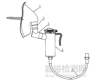 典型面罩式氣流霧化器產(chǎn)品通常由罩體(面罩)、霧化杯、連接管和接口組成,其結(jié)構(gòu)示意圖及實物照片(圖1)如下所示。