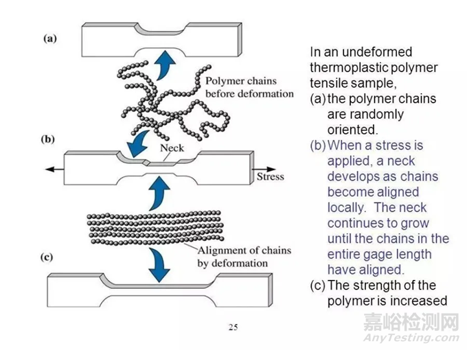 從圖上可以看出來,聚乙烯的球晶起到了彈簧的作用。那么在屈服拉伸強(qiáng)度之內(nèi),球晶是可以復(fù)原的;而在屈服強(qiáng)度之外,球晶就被打開了,成為分子間的鏈,回不去了,宏觀的表現(xiàn)就是聚乙烯材料被拉長(zhǎng)了。最后,在斷裂拉伸強(qiáng)度的時(shí)候,材料被拉斷。