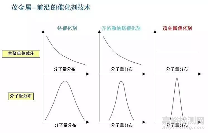 再比如普通的齊格勒納塔(ZN)催化劑生產(chǎn)的聚乙烯和茂金屬(MAO)催化劑生產(chǎn)的聚乙烯。因?yàn)槊饘倬垡蚁└?、更均勻的分子量分布,所以表現(xiàn)出更好的力學(xué)性能,甚至光學(xué)性能。相比LLDPE,茂金屬聚乙烯(MPE)物理性能的提升是全面的,超越性的。