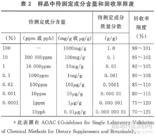 對于化學(xué)藥應(yīng)報告已知加入量的回收率(%),或測定結(jié)果平均值與真實(shí)值之差及其相對標(biāo)準(zhǔn)偏差或置信區(qū)間(置信度一般為95% );對于中藥應(yīng)報告供試品取樣量、供試品中含有量、對照品加入量、測定結(jié)果和回收率(%)計算值,以及回收率(%)的相對標(biāo)準(zhǔn)偏差(RSD% )或置信區(qū)間。樣品中待測定成分含量和回收率限度關(guān)系可參考表2 。在基質(zhì)復(fù)雜、組分含量低于0.01%及多成分等分析中,回收率限度可適當(dāng)放寬。