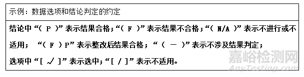 數(shù)據(jù)判定的方式可以是“√”、“X”、 “P”、“F”、“Pass”、“Fail”、“/”、“N/A”、“—”、“合格”、“不合格”、“不適用”等清晰無歧義的描述,并且應(yīng)在記錄的顯著位置描述本記錄中對數(shù)據(jù)判定方式的約定。