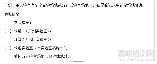 全部或部分檢測項目在分包實驗室場地或委托方實驗室場地進(jìn)行時,應(yīng)原始記錄適當(dāng)位置,例如在檢測項目旁注明該場地的名稱。