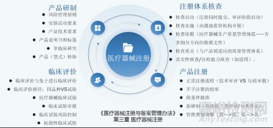 關于醫(yī)療器械注冊,《醫(yī)療器械注冊與備案管理方法》從產品研制、臨床評價、注冊體系核查、產品注冊4個維度進行了詳細規(guī)范。