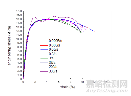 在應(yīng)變速率0.001/s至1000/s區(qū)間內(nèi),要獲得不同數(shù)量級(jí)下的應(yīng)力-應(yīng)變曲線,需要不同的測(cè)試設(shè)備,即準(zhǔn)靜態(tài)萬(wàn)能材料試驗(yàn)機(jī)和高速拉伸試驗(yàn)機(jī)。準(zhǔn)靜態(tài)萬(wàn)能材料試驗(yàn)機(jī)可滿足應(yīng)變速率0.001/s至10/s(準(zhǔn)靜態(tài)拉伸應(yīng)變速率)下的測(cè)試,高速拉伸試驗(yàn)機(jī)可滿足應(yīng)變速率10/s至1000/s(高速拉伸應(yīng)變速率)下的測(cè)試。