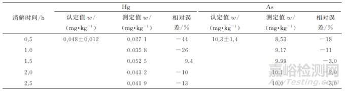 表2 不同消解時(shí)間下汞、砷的測(cè)定結(jié)果