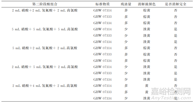 參考HY/T 147.2-2013中的電熱板法和石墨消解法的相關(guān)文獻(xiàn),分別稱取0.2gGBW 07314、黃海海洋沉積物標(biāo)準(zhǔn)物質(zhì)(GBW 07333)和南海海洋沉積物標(biāo)準(zhǔn)物質(zhì)(GBW 07334),先加入5mL鹽酸和5mL硝酸(第一階段),于120℃消解2h,之后加入一定量的硝酸、氫氟酸和高氯酸(第二階段),于180℃消解3~5h至酸被趕盡。第二階段不同用量消解酸組合的消解效果見表3。