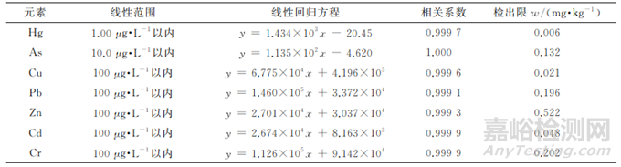 按照儀器工作條件測(cè)定,以各待測(cè)元素的質(zhì)量濃度為橫坐標(biāo),待測(cè)元素與內(nèi)標(biāo)響應(yīng)強(qiáng)度比值為縱坐標(biāo)繪制標(biāo)準(zhǔn)曲線,銅、鉛、鋅、鎘、鉻的線性參數(shù)見表6。