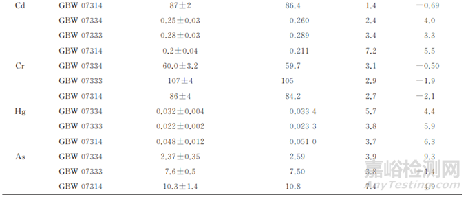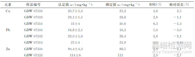 結(jié)果表明,各元素測(cè)定值均在認(rèn)定值的不確定度范圍內(nèi),測(cè)定值的RSD為1.4% ~7.4%,相對(duì)誤差為-3.0% ~9.3%,滿足實(shí)驗(yàn)室分析的要求 。