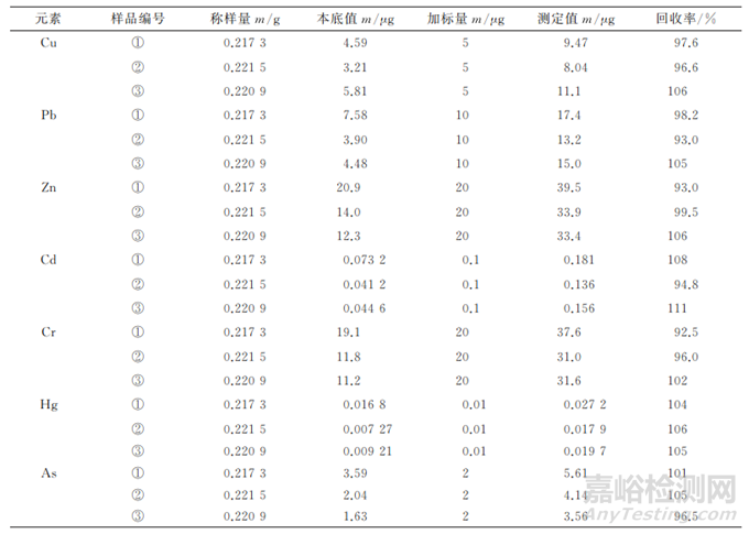 由表8可知,7種元素的回收率為92.5% ~111%,滿足實(shí)驗(yàn)室分析要求。