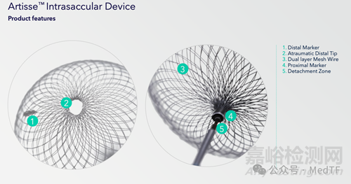 美敦力作為神經(jīng)介入主要玩家,也是早早加入到這個(gè)細(xì)分賽道。其第一代瘤內(nèi)擾流裝置是Medina,與彈簧圈配合使用的完全閉塞率超過(guò)80%。美敦力看到Medina一些不足,為此其開發(fā)出新一代瘤內(nèi)擾流裝置Artisse,旨在滿足復(fù)雜的寬頸分叉動(dòng)脈瘤的需求,這些動(dòng)脈瘤傳統(tǒng)上是通過(guò)支架輔助彈簧圈、彈簧圈輔助頸橋裝置和其他瘤內(nèi)擾流裝置來(lái)治療。前兩種方法需要多個(gè)步驟和多個(gè)裝置,支架輔助彈簧圈需要雙重抗血小板治療,這可能會(huì)給破裂的動(dòng)脈瘤帶來(lái)挑戰(zhàn)。