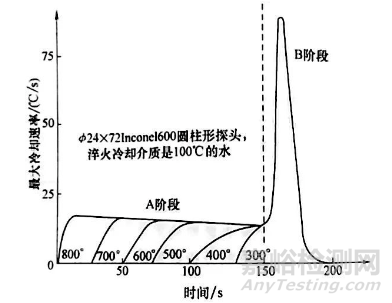 圖2 英科(Inconel)鎳600探頭在水中淬火時冷卻速率與時間的關系(虛線代表了萊登弗羅斯特溫度)
