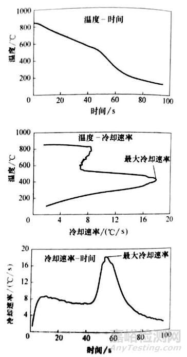 根據(jù)測得的冷卻曲線,將冷卻速率曲線視作時間或溫度的函數(shù)來計算是可能的。試樣從任一溫度冷卻下來所需的時間、任一時刻的溫度、冷卻至任一溫度范圍所需的時間,都可以很容易地通過計算得到。這些計算通常是由現(xiàn)成的電子數(shù)據(jù)處理軟件完成的,從這一分析中得到初始的 “時間-溫度” 數(shù)據(jù)。圖3所示為冷卻曲線數(shù)據(jù)的各種常用表示方法。