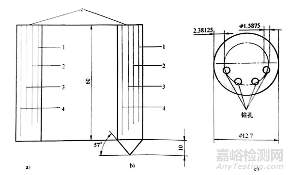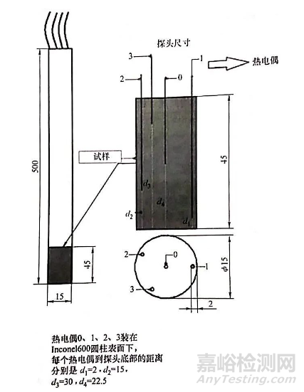注:一個熱電偶插入深度40mm處,另一個插入深度50mm處;熱電偶孔直徑為1.58mm,位于探頭表面下2.38mm。