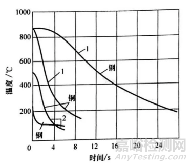 6) 在焊接到外套上的測量接點處使用導熱膠并不能提高靈敏度。選定了數(shù)據(jù)采集系統(tǒng)和探頭設計與材料之后,將探頭加熱到合適的溫度并浸入要研究的淬火冷卻介質(zhì)中。收集 溫度-時間數(shù)據(jù),可以得到一條時間-溫度 冷卻曲線,能說明在表面發(fā)生的不同冷卻機制,下面將對冷卻曲線進行分析。