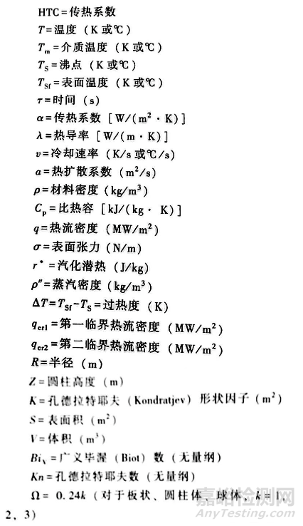 本節(jié)概述淬火過程中傳熱系數(shù)和熱流密度的基本知識。后面將介紹簡化方程方法的各種應用實例。例如,將簡單形狀的鋼件淬入液體型可蒸發(fā)淬火冷卻介質(zhì)中,分析這一過程中發(fā)生的傳熱,就可以考慮用簡化方法來計算冷卻時間和冷卻速率。并將討論利用試驗得到了準確的淬火過程數(shù)學模型、表面溫度或表面下溫度之后,通過解一個恰當?shù)姆磫栴}來計算傳熱系數(shù)(HTC ) 的簡化方法。正則熱條件理論用于冷卻時間和冷卻速率的測定,基于它來計算平均傳熱系數(shù)的方法也將得到介紹。需要用到以下符號: