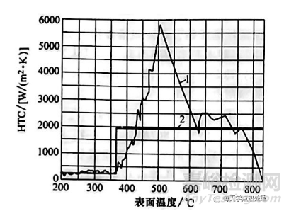 科瑞考斯基(Krukovskyi) 使用了牛頓-高斯(Newton-Gauss) 和吉洪諾夫方法。在美國廣泛使用一種由貝克(Beck) 等人所推薦的求解反問題的新方法,而吉洪諾夫方法在歐洲則廣為人知。求解第一種傳熱模式的反問題的結果,通常以傳熱系數(shù)(HTC) 與表面溫度的關系的形式呈現(xiàn),如圖13所示。這些傳熱系數(shù)(HTC) 被用在計算淬火過程中,包括決定鋼相變的冷卻時間和冷卻速率值。