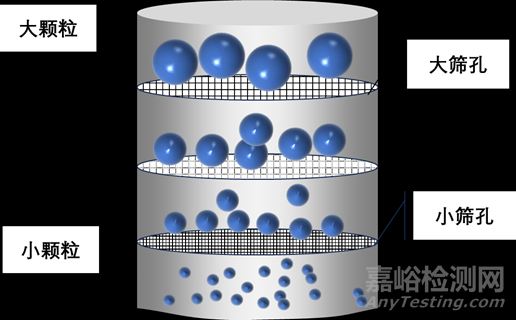 篩分法是利用篩孔將粉體機械阻擋的一種分級方法,通過將篩孔大小不同的篩網(wǎng)疊放在一起,對樣品進行篩分,粒徑小于篩孔的顆粒漏過篩網(wǎng),大于篩孔的顆粒截留在篩網(wǎng)上,然后通過稱量不同篩子剩余樣品的質(zhì)量,從而得到以篩網(wǎng)孔徑為界限樣品的粒徑大小及分布范圍。(圖2)