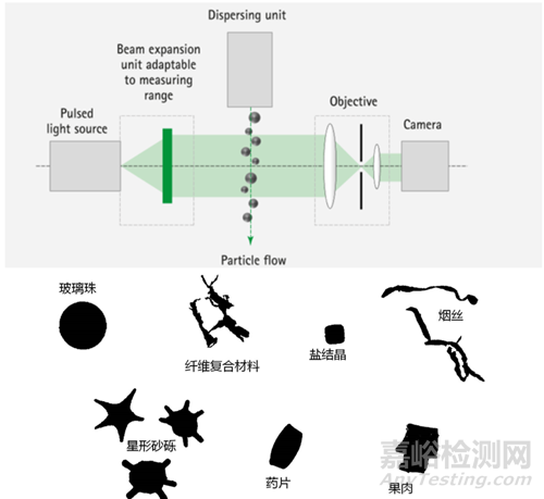 圖4:動態(tài)顆粒圖像分析儀工作原理示意圖與捕捉到的二維圖像