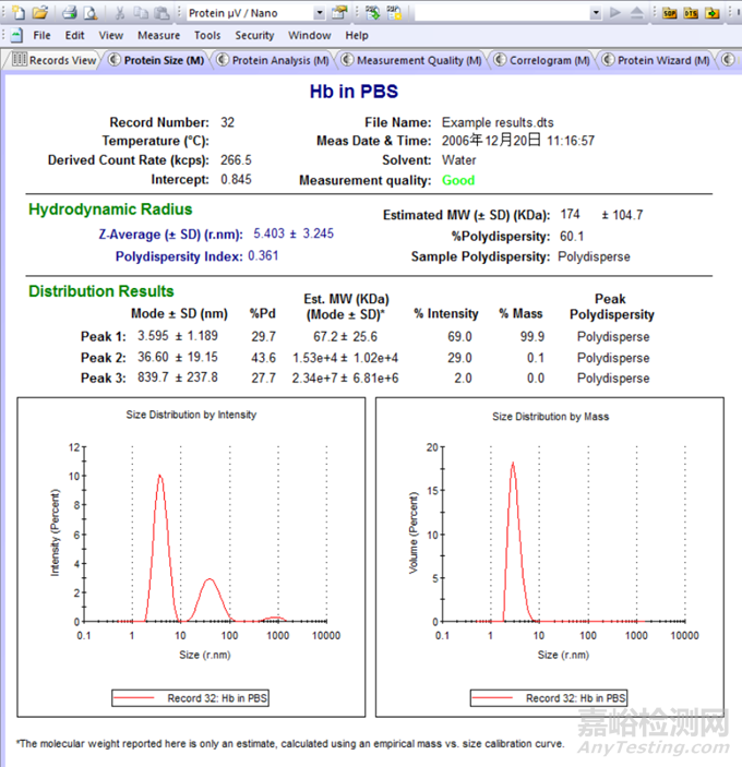 DLS生成的基礎粒徑分布是光強度分布,也可以進一步轉(zhuǎn)化為體積分布和數(shù)量分布。如圖(11)顯示了蛋白質(zhì)粒徑測定代表性結果,其中關鍵的信息有平均粒徑與分布系數(shù)(particle dispersion index,PDI),如圖平均粒徑Z-Average(±SD)為5.403±3.245nm,PDI為0.361。PDI體現(xiàn)了粒子粒徑均一程度,是粒徑表征的一個重要指標。分布系數(shù)<0.05:表明為單分散體系,如一些乳液的標樣;分布系數(shù)<0.08:表明為近單分散體系,但動態(tài)光散射只能用一個單指數(shù)衰減的方法來分析,不能提供更高的分辨率;分布系數(shù)0.08-0.7:適中分散度的體系,運算法則的最佳適用范圍;分布系數(shù)>0.7:尺寸分布非常寬的體系,很可能不適合光散射的方法分析。