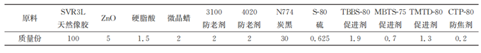 試驗(yàn)原料:GT-300型CNTs,純度大于 98%,直徑大于50nm,長度在10~20μm,壁數(shù)為5~10層,常州稚田新材料科技有限公司提供;越南SVR3L天然橡膠,東莞順捷塑膠科技有限公司提供;N774炭黑,上海京華化工廠有限公司提供;硬脂酸,上海制皂有限公司提供;硫(S-80)、氧化鋅ZnO、防老劑(4020)~防老劑(3100)、微晶蠟 (9332F)、促進(jìn)劑(TMTD-80)、促進(jìn)劑(TBBS-80)、促進(jìn)劑(MBTS- 75)、防焦劑(CTP-80),均為市售工業(yè)級(jí)。按表1的試驗(yàn)基礎(chǔ)配方進(jìn)行配料,在制備過程中用0.5份CNTs分別替換基礎(chǔ)配方中0(基礎(chǔ)配方,未用CNTs替換碳黑),2,4,6,8份炭黑。