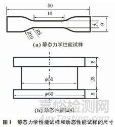 試驗(yàn)材料的制備流程如下:將原料在 XSM-500型密煉機(jī)中進(jìn)行密煉,溫度為70℃,轉(zhuǎn)速為70r·min-1,時(shí)間為10min;在S(X)K-160型開煉機(jī)上進(jìn)行混煉,打三角包薄通10次出片,得到混煉膠;將混煉膠放入對(duì)應(yīng)模具中,在XLB-D350×350×2型平板硫化機(jī)中進(jìn)行硫化,硫化溫度為160℃,硫化時(shí)間為10min。制備靜態(tài)力學(xué)性能試樣和動(dòng)態(tài)性能試樣,試樣的尺寸如圖1所示。動(dòng)態(tài)性能試樣為橡膠金屬件,其中間部分為天然橡膠復(fù)合材料,上下金屬板為鋁板,在硫化過程中完成金屬與橡膠的黏合。