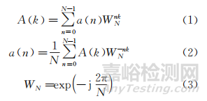 式中:a(n)為長度為M的有限長序列,即轉(zhuǎn)換前的時(shí)域信號(hào),n取0,… ,N-1;N為快速傅里葉變換區(qū)間長度,N≥M;A(k)為響應(yīng)加速度時(shí)域信號(hào)經(jīng)傅里葉變換后的頻域信號(hào);k為頻率;WN為N次方根的復(fù)數(shù)單位。
