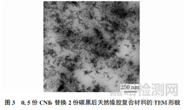 0.5份CNTs替換不同份數(shù)炭黑制備的天然橡膠復(fù)合材料微觀形貌相似,所以僅觀察0.5份CNTs替換2份炭黑的天然橡膠復(fù)合材料。由圖 3可以看出,復(fù)合材料由線條狀CNTs、黑色團(tuán)塊狀炭黑以及橡膠基體組成,同時(shí)CNTs在復(fù)合材料中分布較為均勻,說明制備效果較好。
