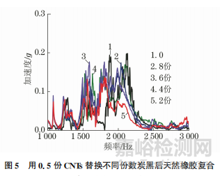 由圖5可以發(fā)現(xiàn),用0.5份CNTs替換不同份數(shù)炭黑后復(fù)合材料的響應(yīng)加速度在大于 2000Hz的高頻下比未用CNTs替換炭黑的復(fù)合材料低,且用0.5份CNTs替換2份炭黑的復(fù)合材料的降低幅度最大。響應(yīng)加速度降低幅度越大,說明復(fù)合材料在高頻振動(dòng)下的阻尼性能越好,越能夠有效地吸收和耗散振動(dòng)能量,從而起到良好的減振作用。