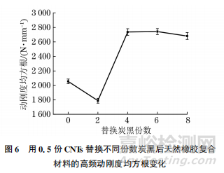 由圖6可見,隨著CNTs替換炭黑份數(shù)的增加,復(fù)合材料動(dòng)剛度均方根呈先減后增的趨勢 ,用0.5份CNTs替換2份炭黑后復(fù)合材料的動(dòng)剛度均方根最小,比未用CNTs替換炭黑的復(fù)合材料動(dòng)剛度均方根降低了12.94%,表明此時(shí)天然橡膠復(fù)合材料具有最好的高頻動(dòng)態(tài)性能??梢钥闯?,適量的CNTs與炭黑共混可以提升復(fù)合材料的高頻動(dòng)態(tài)性能。