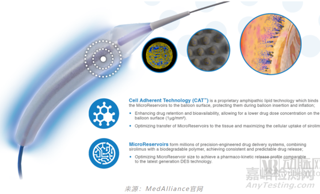 MedAlliance獨(dú)特的DEB技術(shù)涉及微儲(chǔ)層,其中包含可生物降解聚合物與作為血管成形術(shù)球囊表面涂層的抗再狹窄藥物西羅莫司混合物。這種微儲(chǔ)層可提供長(zhǎng)達(dá)90天的可控和持續(xù)藥物釋放。MedAlliance專有的CAT™(細(xì)胞粘附技術(shù))使微儲(chǔ)層能夠涂覆到球囊上,并在通過(guò)球囊擴(kuò)張輸送時(shí)有效轉(zhuǎn)移以粘附到血管內(nèi)腔。