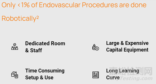 超過(guò) 75% 的介入治療醫(yī)生計(jì)劃將機(jī)器人技術(shù)納入其治療方案,但實(shí)際上只有不到1% 的血管內(nèi)手術(shù)是通過(guò)機(jī)器人完成的,因此目前市場(chǎng)上的一次性血管介入手術(shù)機(jī)器人滲透率較低。