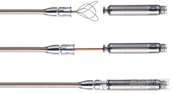 除此之外,雅培還開發(fā)了專用的 Aveir輸送和取出導(dǎo)管,其為一種帶偏轉(zhuǎn)機(jī)構(gòu)的可操縱輸送導(dǎo)管,獨(dú)特的三環(huán)圈套結(jié)構(gòu)能夠和 Aveir 進(jìn)行裝配,如下圖所示: