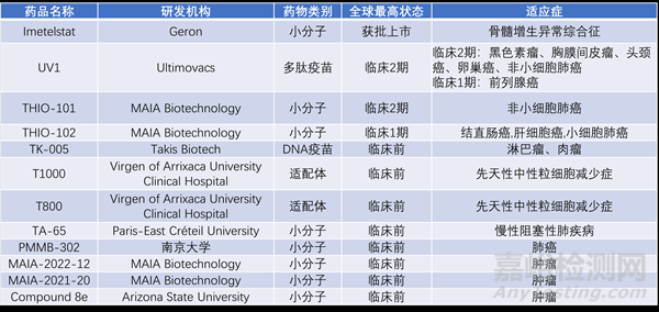 除了Rytelo,目前全球有多款同樣靶向端粒酶的在研藥品處于臨床前與臨床階段,分別針對不同適應癥: