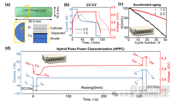 圖2 (a)電池樣品;(b)不同C率下的充放電測試曲;(c)不同C率下的SOH-循環(huán)次數(shù)曲線;(d) HPPC測試的典型流程和關鍵點