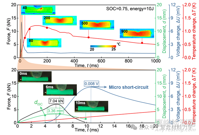 在機械沖擊加載開始時(以SOC=0.75、10 J沖擊為例),加載位移和力均立即增加(圖4)。在加載進行過程中,電池外殼表面出現(xiàn)了明顯的凹痕,并隨著加載的進行而加深。先是力達到了峰值,其次是凹痕處的位移達到了最大值。與此同時,電壓開始下降。這是因為電池受到擠壓,因此隔膜可能出現(xiàn)變形或破裂,從而導致ISC(內短路)和電壓降低。紅外熱像圖說明ISC在加載點(凹痕周圍)的發(fā)生。溫度峰值明顯滯后于其他信號,反映了焦耳熱傳播到達電池外殼表面所需一定時間。最后隨著卸載,力逐漸減小,由于電池的塑性變形,位移未完全恢復。電壓回復逐漸接近其初始值,說明伴隨著軟短路的出現(xiàn)。