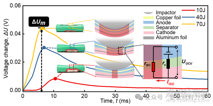 通過數(shù)采實時監(jiān)測電壓信號的實驗結果顯示,在高沖擊能量下,電響應存在顯著差異:1)電壓變化更快;2)最大壓降更為顯著;3)電壓恢復速度更為緩慢(見圖5)。這種現(xiàn)象可以歸因于較大的沖擊能量對應著更高的加載速度,意味著更早達到短路臨界位移,進而加速了ISC現(xiàn)象的發(fā)生。同時,內部組件的結構變形增加,擴大了陰極和陽極之間的接觸面積,導致短路電阻減小,從而產(chǎn)生更大的壓降和更慢的恢復速度。