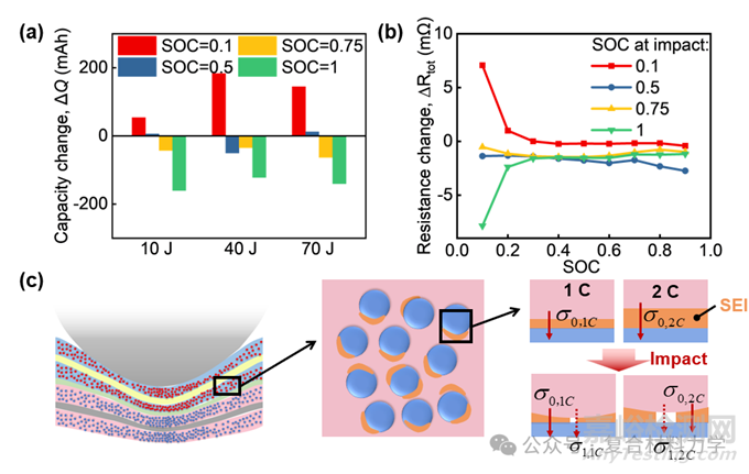通過沖擊引起的容量變化和容量衰減速率的研究表明,沖擊能量對容量衰減影響不大,但SOC水平有顯著影響(見圖6a)。在低SOC下,容量增加,而在高SOC下則減少。沖擊可能導致活性顆粒脫落,引起部分活性材料損傷和輕微ISC。內阻方面,沖擊后內阻普遍下降,且更大的沖擊能量導致更顯著的變化(圖 6b)。在高SOC下,電極剛度增加,易導致裂紋和新接觸,進而影響內阻。在不同C倍率下的比較表明,在1C下內阻減小趨勢更明顯,可能因為在低C倍率(1 C)下,SEI膜的生長相對較慢較薄,充放電循環(huán)引起的內部機械應變和裂紋需要更多SEI膜來穩(wěn)定,導致內阻減小。示意圖如圖6c所示。