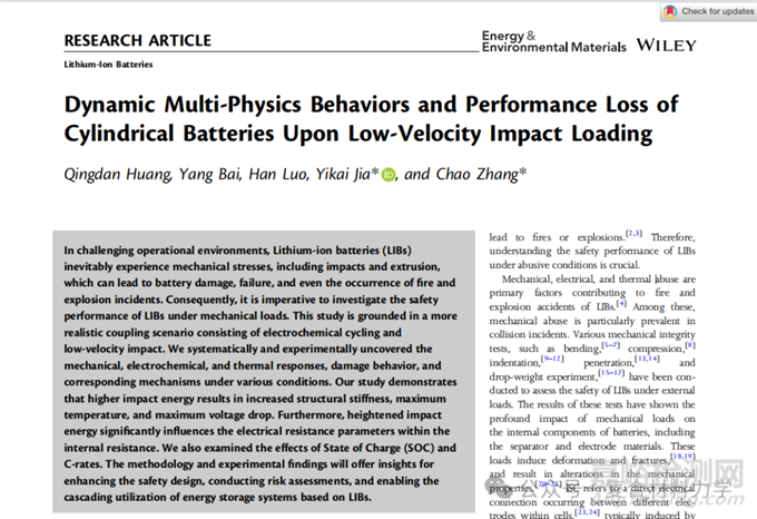 近日,能源與環(huán)境領域知名期刊《Energy & Environmental Materials,簡稱EEM》在線發(fā)表了西北工業(yè)大學民航學院/航空學院張超教授團隊有關圓柱鋰電池在動態(tài)載荷下的多場耦合失效機理行為的最新研究進展,揭示了圓柱鋰電池在動態(tài)加載下的損傷行為和失效機理,分析了沖擊能量、沖擊時刻荷電狀態(tài)等因素對圓柱鋰電池失效模式和損傷程度的影響,論文題目為“Dynamic multi-physics behaviors and performance loss of cylindrical batteries upon low-velocity impact loading”。論文的第一作者為西北工業(yè)大學民航學院碩士研究生黃慶丹,通訊作者為西北工業(yè)大學民航學院/航空學院張超教授和民航學院賈亦楷教授。
